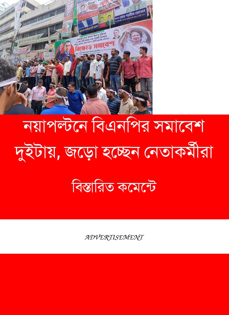 সরকারের পদত্যাগ, নির্বাচনকালীন নিরপেক্ষ তত্ত্বাবধায়ক সরকারসহ ১০ দফা দাবিতে বিএনপির বিক্ষোভ সমাবেশ আজ। দুপুর দুইটায় রাজধানীর নয়াপল্টনে দলটির কেন্দ্রীয় কার্যালয়ে সামনে এ সমাবেশ অনুষ্ঠিত হবে। সমাবেশকে কেন্দ্র করে আগে থেকেই জড়ো হয়েছেন হাজার হাজার নেতাকর্মী। ব্যানার ফেস্টুন নিয়ে আসছেন আরো অনেকে। এদিকে বিভিন্ন জেলা থেকে আসা নেতাকর্মীদের উপস্থিতি দেখা গেছে নয়াপল্টন ও তার পার্শ্ববর্তী এলাকায়।