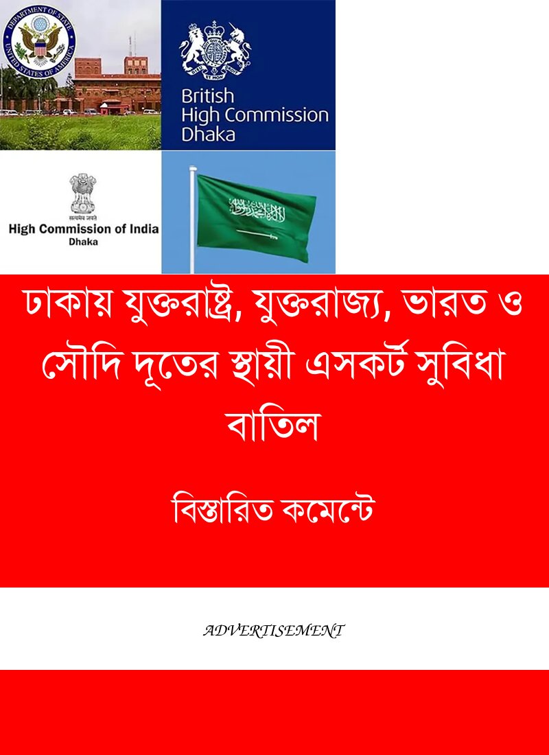 ঢাকায় নিযুক্ত মার্কিন যুক্তরাষ্ট্র, যুক্তরাজ্য, ভারত ও সৌদি আরবের রাষ্ট্রদূতের বিশেষ নিরাপত্তা সুবিধা তথা সার্বক্ষণিক পুলিশ এসকর্ট প্রত্যাহার করে নিয়েছে সরকার। এখন থেকে তারা আর স্থায়ীভাবে পুলিশ এসকর্ট সুবিধা পাবেন না। রোববার সরকারি এক সিদ্ধান্তে দূতদের বিশেষ এসকর্ট সুবিধা প্রত্যাহার করা হয়েছে। একাধিক সাবেক পররাষ্ট্র সচিব জানিয়েছেন, কমপক্ষে ৩০ বছর আগে ঢাকাস্থ যুক্তরাষ্ট্র, বৃটেন এবং ভারতের দূতদের জন্য ওই বিশেষ এসকর্ট সুবিধা চালু হয়। পরবর্তীতে কোনো এক সময়ে ওই তালিকায় সৌদি আরবের রাষ্ট্রদূতকে অন্তর্ভুক্ত করা হয়। তবে অন্য দূতরা পররাষ্ট্র মন্ত্রণালয়ে আবেদন করে বিশেষ সময়ে ওই সুবিধা গ্রহণ করতেন। রাষ্ট্রদূতদের এসকর্ট সুবিধা প্রত্যাহারের বিষয়টি স্বীকার করেছেন পররাষ্ট্রমন্ত্রী ড. একে আবদুল মোমেন। কেবল এসকর্ট প্রত্যাহারই নয়, রাষ্ট্রদূতদের গাড়িতে ফ্লাগ উড়ানো বন্ধের বিষয়টিও বিবেচনায় রয়েছে বলে জানান তিনি। এদিকে ঢাকা মহানগর পুলিশের কমিশনার খন্দকার গোলাম ফারুক মানবজমিনকে বলেন, এখন কোনো দূতই আর বিশেষ বা স্থায়ী এসকর্ট সুবিধা পাবেন না। সবাইকে এক লেভেলে আনা হয়েছে।