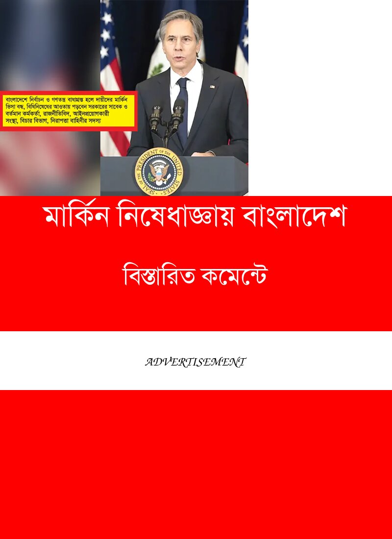 বাংলাদেশে ভোটের পরিবেশ ফিরিয়ে আনতে নজিরবিহীন এক ঘোষণা দিয়েছে যুক্তরাষ্ট্র। ওই ঘোষণায় নির্বাচনে বাধা প্রদানকারীদের মার্কিন ভিসা বন্ধের হুশিয়ারি দেয়া হয়েছে। যুক্তরাষ্ট্রের ইমিগ্রেশন অ্যান্ড ন্যাশনালিটি অ্যাক্টের অধীনে কেবলমাত্র বাংলাদেশের জন্য ভিসা নীতিটি জারি করা হয়েছে। যাতে বলা হয়েছে, বাংলাদেশের নির্বাচনে বাধা সৃষ্টি করে গণতন্ত্রকে ক্ষতিগ্রস্ত কারী ব্যক্তি, পরিবার বা প্রতিষ্ঠানের কর্তাদের বিরুদ্ধে ভিসায় বিধি-নিষেধ আরোপ করা হবে। বুধবার বাংলাদেশ সময় মধ্যরাতে মার্কিন পররাষ্ট্রমন্ত্রী অ্যান্থনি জে ব্লিংকেন ভিসা কড়াকড়ি সংক্রান্ত ওই ঘোষণা দেন। যাকে ‘ভিন্নরকম নিষেধাজ্ঞা’ হিসাবে দেখছেন বিশ্লেষকরা। ব্লিংকেনের টুইট বার্তা, স্টেট ডিপার্টমেন্ট এবং ঢাকাস্থ মার্কিন দূতাবাসের অফিসিয়াল ওয়েবসাইটে বাংলাদেশ বিষয়ক নতুন ওই ভিসা নীতি বা ঘোষণাটি একযোগে প্রচারিত হয়। তাছাড়া তাৎক্ষণিক চ্যানেল আই’র তৃতীয় মাত্রার অনুষ্ঠানে যুক্ত হয়ে মার্কিন সহকারী পররাষ্ট্রমন্ত্রী ডোনাল্ড লু ভিসা কড়াকড়ি বিষয়ক নতুন নীতি নিয়ে উত্থাপিত বিভিন্ন প্রশ্নের জবাব দেন। ব্লিংকেনের ঘোষণায় খোলাসা করেই বলা হয়, বাংলাদেশের অবাধ সুষ্ঠু নির্বাচন নিশ্চিতে কেবলমাত্র বাংলাদেশের জন্য ওই ভিসা নীতি প্রণয়ণ করা হয়েছে। এই নীতির অধীনে বাংলাদেশে গণতান্ত্রিক নির্বাচন প্রক্রিয়াকে দুর্বল বা বাধা প্রদানের জন্য দায়ী ব্যক্তি এবং তাদের পরিবারের সদস্য তথা জীবনসঙ্গী, ছেলে বা মেয়ের ভিসার ওপর বিধি-নিষেধ আরোপিত হবে।