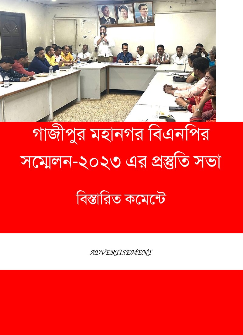 গাজীপুর মহানগর বিএনপির সম্মেলন-২০২৩ এর প্রস্তুতি সভা অনুষ্ঠিত হয়। ঢাকা নয়াপল্টনের বিএনপির কেন্দ্রীয় কার্যালয়ে এ অনুষ্ঠানের আয়োজন করা হয়৷উক্ত প্রস্তুতি সভায় উপস্হিত ছিলেন বিএনপির সাংগঠনিক সম্পাদক এড: আব্দুস সালাম ও সহ সাংগঠনিক সম্পাদক বেনজির আহমেদ টিটু , গাজীপুর মহানগর বিএনপির সভাপতি এম. মন্জুরুল করিম রনি ও সদস্য সচিব শওকত হোসেন সরকার সহ যুগ্ম আহবায়ক গন, বিভিন্ন থানার সভাপতি ও সাধারন সম্পাদক,যুবদল, স্বেচ্ছাসেবক দল, ছাত্রদল , মহিলাদলেরসহ তাঁতীদলের নেতৃবৃন্দ।