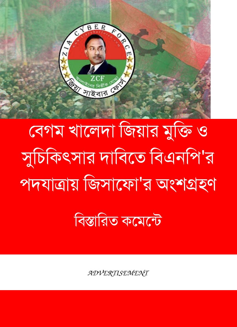 প্রতিহিংসার বিচারে বন্দী, গণতন্ত্র পুনরুদ্ধার আন্দোলনে জনগণের আস্থার প্রতীক, দেশনেত্রী বেগম খালেদা জিয়ার নিঃশর্ত মুক্তি ও উন্নত চিকিৎসার দাবি ও অবৈধ অনির্বাচিত সরকারের পদত্যাগ এর এক দফা দাবীতে বিএনপি’র পদযাত্রায় বাংলাদেশ জাতীয়তাবাদী দলের স্বেচ্ছাসেবী সংগঠন “জিয়া সাইবার ফোর্স” এর বিভিন্ন থানা,জেলা ও মহানগরে নেতৃবৃন্দের ব্যাপক উপস্থিতি।