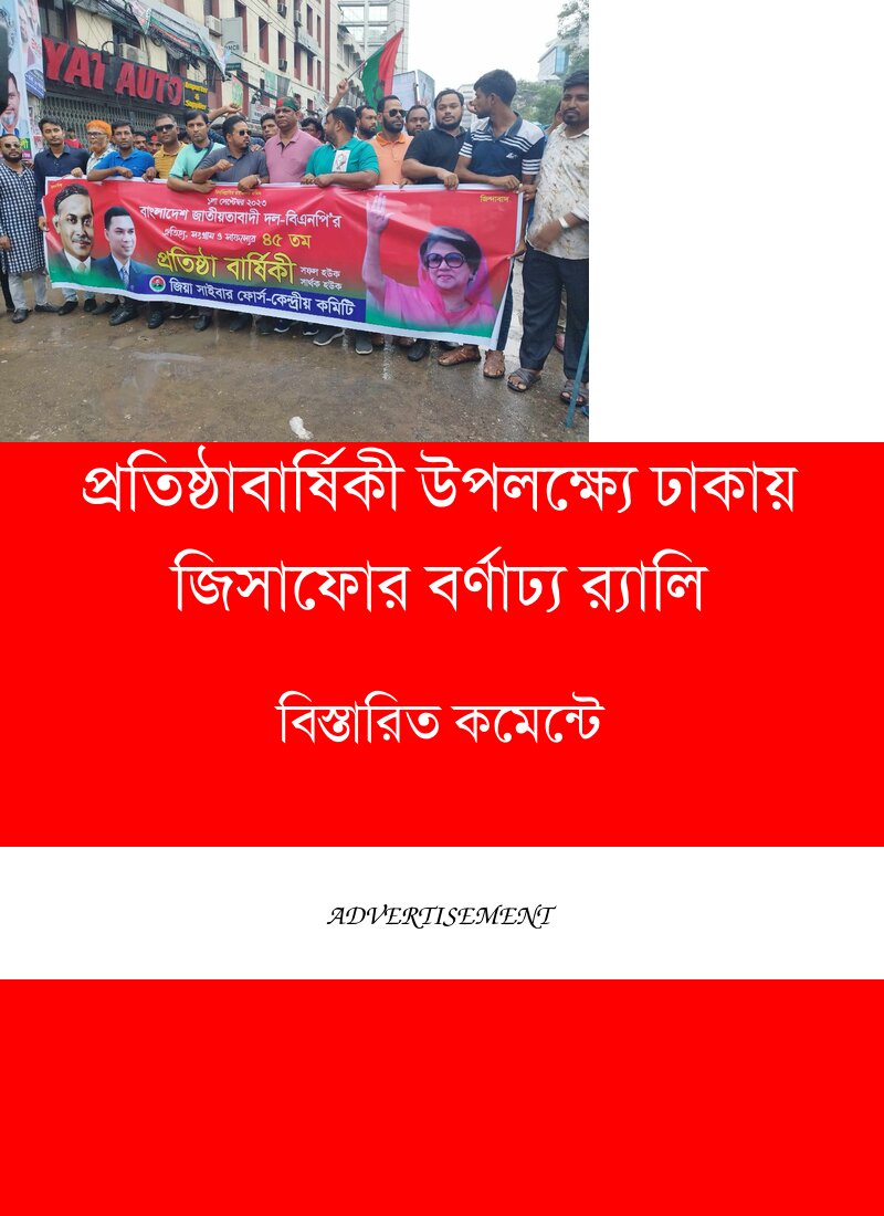বিএনপির ৪৫তম প্রতিষ্ঠাবার্ষিকী উপলক্ষ্যে ঢাকায় বর্ণাঢ্য র্যালি করছে বিএনপির স্বেচ্ছাসেবী সংগঠন জিয়া সাইবার ফোর্স। রাজধানীর নয়াপল্টনে বিএনপির কেন্দ্রীয় কার্যালয়ের সামনে থেকে এই র্যালিটি শুরু হয়। র্যালিটি কেন্দ্রীয় কার্যালয়ের সামনে থেকে ফকিরাপুল মোড়, নটরডেম কলেজ, শাপলা চত্বর ও ইত্তেফাক মোড় হয়ে রাজধানী মার্কেটে গিয়ে বিএনপি ও এর অঙ্গ সহযোগী সংগঠনের সাথে গিয়ে শেষ হয়। শুক্রবার বিকাল ৪টায় রাজধানীর নয়াপল্টনে দলের কেন্দ্রীয় কার্যালয়ের সামনে থেকে ঢাকা মহানগর উত্তর ও দক্ষিণ বিএনপির যৌথ উদ্যোগে এই র্যালি ও শোভাযাত্রা শুরু হয়। শোভাযাত্রা পূর্ব সমাবেশের জন্য কেন্দ্রীয় কার্যালয়ের সামনে ট্রাকের ওপর অস্থায়ী মঞ্চ তৈরি করা হয়। সেখানে সকল নেতাকর্মীরা উপস্থিত হয়ে সমাবেশ সফল করে। জিসাফো’র র্যালিতে উপস্থিত ছিলেন,সংগঠনটির প্রধান সমন্বয়ক ফ্লাইট লেফটেন্যান্ট অবঃ ড.মুহাম্মদ হারুনুর রশিদ ভূইয়া, সিনিয়র সহ-সভাপতি কেএম হারুন, ভারপ্রাপ্ত সাধারণ সম্পাদক রবিউল ইসলাম তালুকদার, যুগ্ম-সাধারণ সম্পাদক ইমদাদুল হক, দপ্তর প্রধান মাহফুজ হক সহ কেন্দ্রীয় ও বিভিন্ন জেলার নের্তৃবৃন্দ।
