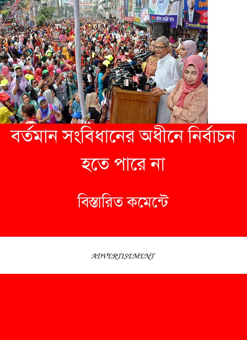 এই সংবিধানের অধীনে নির্বাচন হতে পারে না বলে সাফ জানিয়ে দিয়েছেন বিএনপি মহাসচিব মির্জা ফখরুল ইসলাম আলমগীর। শুক্রবার বিকালে রাজধানীর নয়াপল্টনে বিএনপির কেন্দ্রীয় কার্যালয়ের সামনে জাতীয়তাবাদী মহিলা দলের উদ্যোগে ‘মহিলা সমাবেশে এ কথা বলেন তিনি। বিএনপি চেয়ারপারসন বেগম খালেদা জিয়ার নিঃশর্ত মুক্তি এবং ভারপ্রাপ্ত চেয়ারম্যান তারেক রহমানের মিথ্যা মামলা প্রত্যাহার ও নির্বাচনকালীন নির্দলীয় নিরপেক্ষ সরকার প্রতিষ্ঠার একদফা দাবিতে এই সমাবেশ অনুষ্ঠিত হয়।