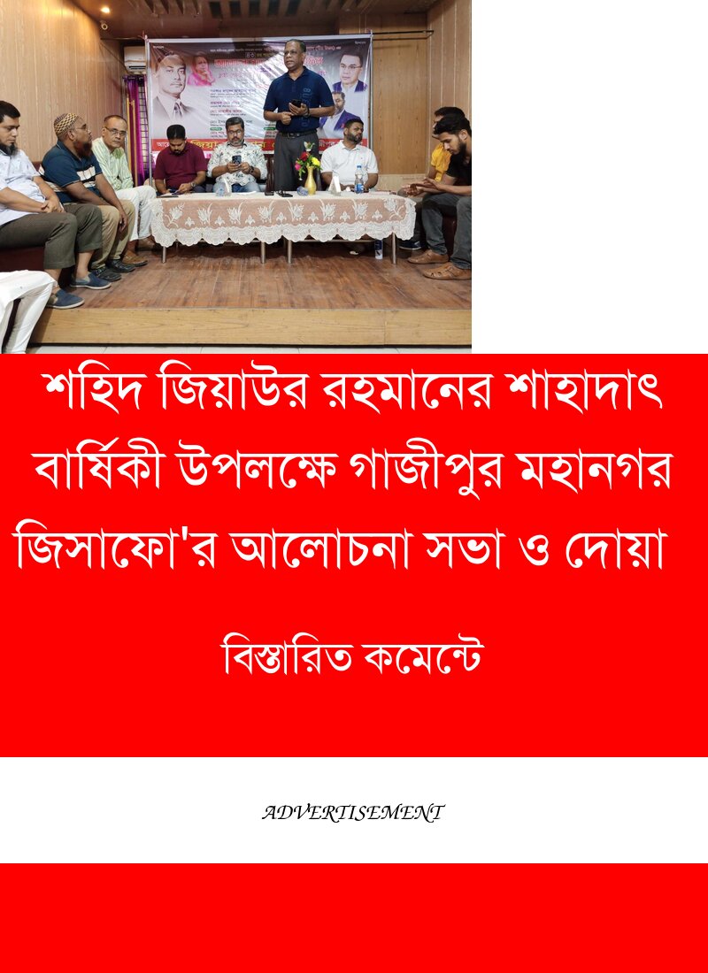 শহীদ রাষ্ট্রপতি জিয়াউর রহমানের ৪৩ তম শাহাদাত বার্ষিকী উপলক্ষে বুধবার গাজীপুর মহানগর জিসাফো আয়োজিত দোয়া ও আলোচনা সভায় বক্তারা এসব কথা বলেন।