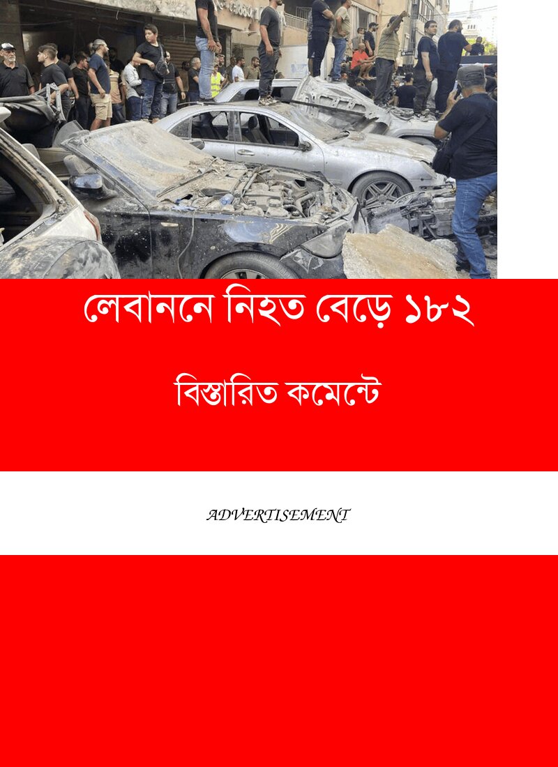 ইসরায়েলের বিমান হামলায় লেবাননে এ পর্যন্ত নিহত হয়েছেন ১৮২ জন এবং আহত হয়েছেন আরও ৭২৭ জন। আহতদের মধ্যে অনেকের অবস্থা আশঙ্কাজনক।