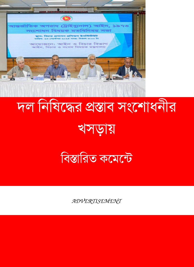 গতকাল রাজধানীর বিচার প্রশাসন প্রশিক্ষণ ইনস্টিটিউটে এক মতবিনিময় সভায় এ প্রস্তাব তুলে ধরা হয়। খসড়া সংশোধনীতে ৪এ, ১৩এ ও ২০এ নামে ৩টি নতুন ধারা এবং ৩(৩) ও ১২(২) নামে ২টি নতুন উপধারা যুক্ত করা হয়। এ ছাড়া ধারা ৩(২)(এ), ৪(২) ও ১৯ ধারায় সংশোধন আনার প্রস্তাব করা হয়। খসরা সংশোধনীতে গণহত্যায় নেতৃত্বের অপরাধে রাজনৈতিক দলকে ১০ বছরের জন্য নিষিদ্ধ করার মতো বিধান যুক্ত করার প্রস্তাব করা হয়েছে।