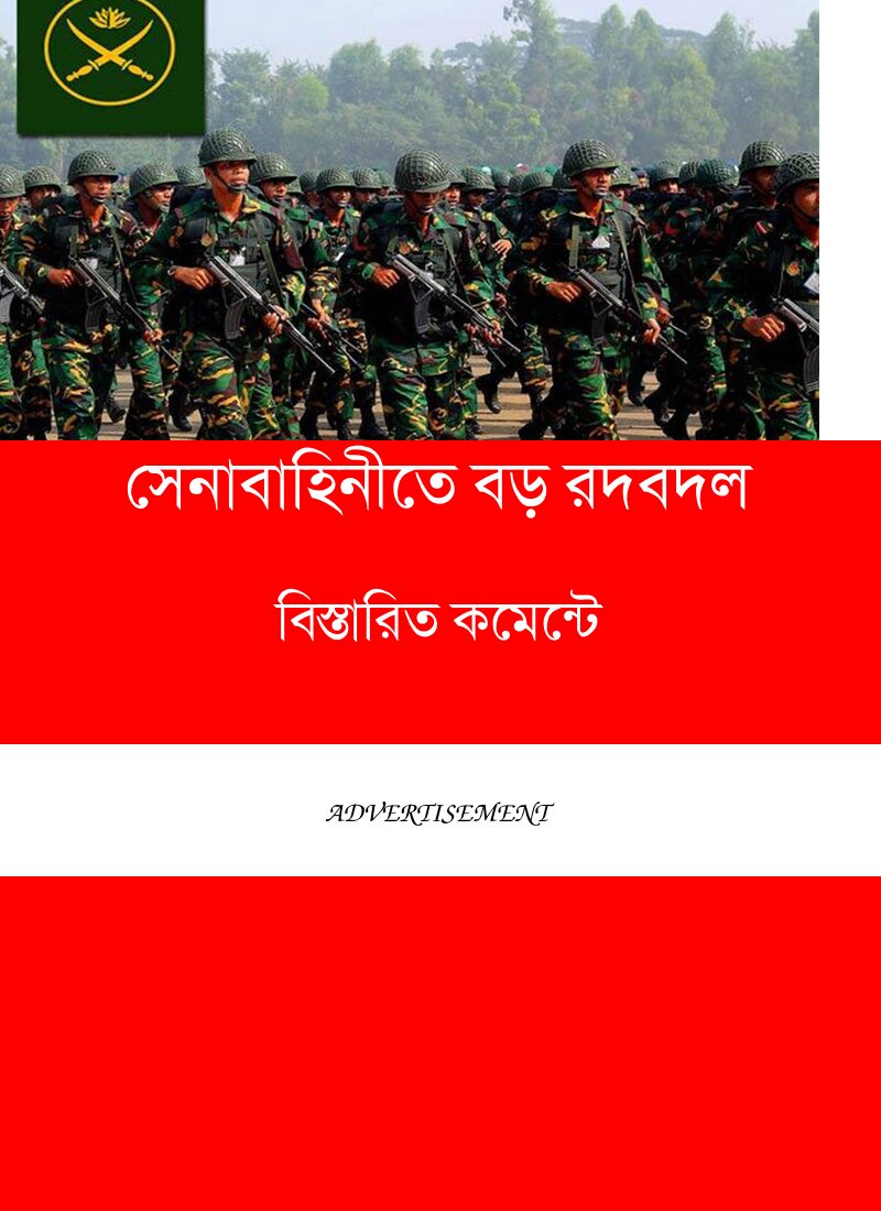 সেনাবাহিনীর উচ্চ পর্যায়ে রদবদল হয়েছে। মেজর জেনারেল পদমর্যাদার দুই কর্মকর্তাকে পদোন্নতি দিয়ে লেফটেন্যান্ট জেনারেল করা হয়েছে। তাদের মধ্যে প্রতিরক্ষা গোয়েন্দা মহাপরিদপ্তরের (ডিজিএফআই) মহাপরিচালক মো. ফয়জুর রহমানকে সেনা সদরের কোয়ার্টার মাস্টার জেনারেলের (কিউএমজি) দায়িত্ব দেয়া হয়েছে। পদোন্নতি পাওয়া ২৪ পদাতিক ডিভিশনের (চট্টগ্রাম সেনানিবাস) জিওসি মো. মাইনুর রহমানকে আর্মি ট্রেনিং অ্যান্ড ডকট্রিন কমান্ডের (আর্টডক) জিওসি করা হয়েছে। ওদিকে ডিজিএফআইয়ে নতুন মহাপরিচালক হয়েছেন মেজর জেনারেল মোহাম্মদ জাহাঙ্গীর আলম। তিনি কুমিল্লায় ৩৩ পদাতিক ডিভিশনের জিওসির দায়িত্ব পালন করে আসছিলেন। আইএসপিআর এর পক্ষ থেকে এসব তথ্য নিশ্চিত করা হয়েছে।