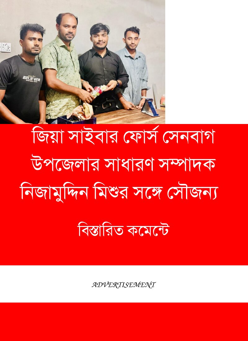 জিয়া সাইবার ফোর্স সেনবাগ উপজেলার সংগঠনকে আরও শক্তিশালী ও গতিশীল করার লক্ষ্যে সম্প্রতি একটি সৌজন্য সাক্ষাৎ অনুষ্ঠিত হয়েছে। সংগঠনের সম্মানিত সাধারণ সম্পাদক জনাব *নিজামুদ্দিন মিশু*’র সঙ্গে সৌজন্যে সাক্ষাৎ করেন জিয়া সাইবার ফোর্স সেনবাগ উপজেলার *যুগ্ম সাধারণ সম্পাদক* ও সৌদি আরব প্রবাসী *বিশিষ্ট ব্যবসায়ী ও সমাজ সেবক শিহাব চৌধুরী*।