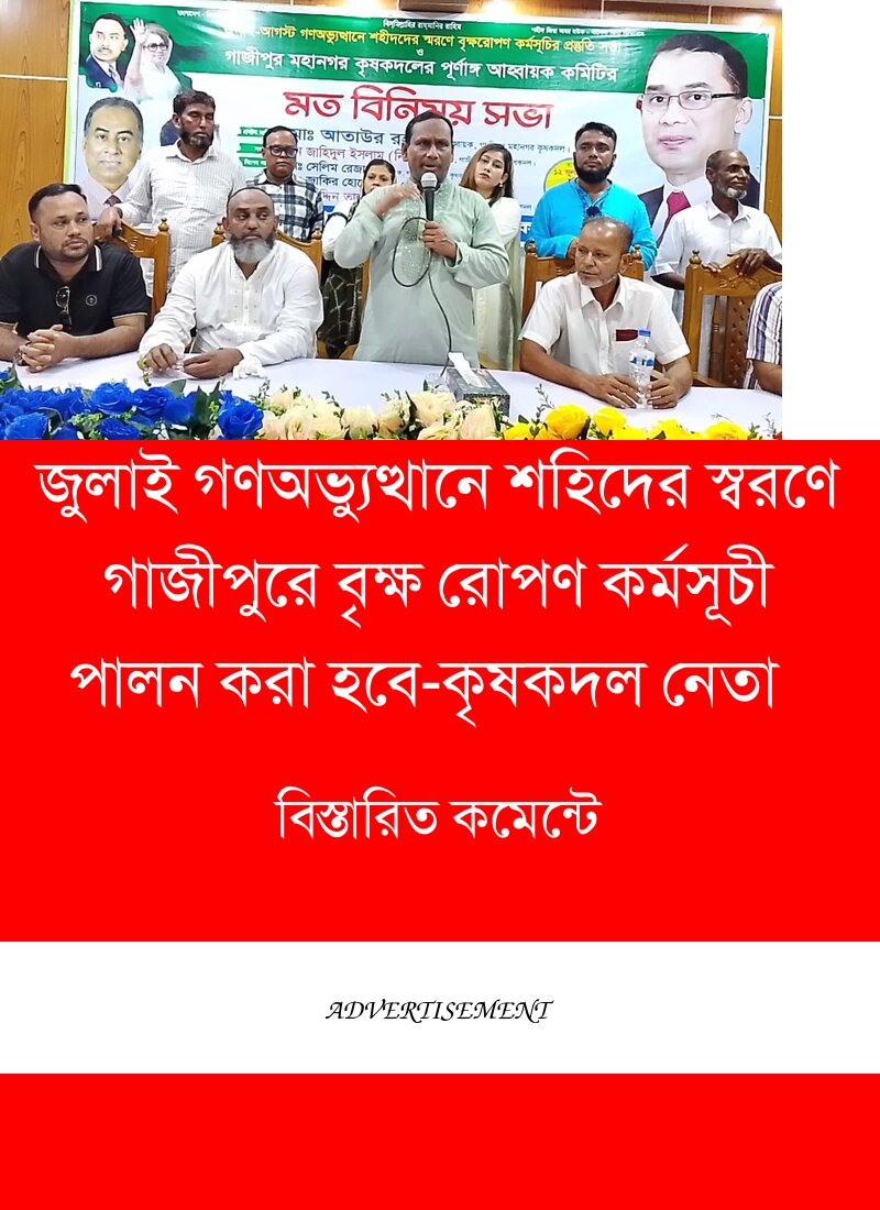 বাংলাদেশ জাতীয়তাবাদী কৃষক দল গাজীপুর মহানগর শাখার আহ্বায়ক আতাউর রহমান এক মতবিনিময় সভায় বলেছেন, জুলাই গণঅভ্যুত্থানে যারা এই দেশের জন্য প্রাণ দিয়েছেন, খুন হয়েছেন, তাদের স্মরণে গভীর শ্রদ্ধা ও সমবেদনা জানাচ্ছি। তিনি জানান, এ মাসের ২০ জুলাই শহীদদের স্মরণে গাজীপুর মহানগর কৃষক দলের উদ্যোগে বৃক্ষরোপণ কর্মসূচি অনুষ্ঠিত হবে।