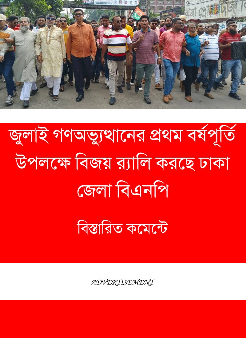 জুলাই গণঅভ্যুত্থানের প্রথম বর্ষপূর্তি উপলক্ষে ঢাকায় বিএনপির বিজয় র্যালিতে কয়েক শত নেতাকর্মী নিয়ে অংশ নিয়েছেন, ঢাকা জেলা বিএনপি সাবেক যুগ্ম সম্পাদক লায়ন মোঃ খোরশেদ । বুধবার (৬ আগস্ট) বিকেল সাড়ে ৪টায় নয়াপল্টনে দলের কেন্দ্রীয় কার্যালয়ের সামনে থেকে র্যালিটি শুরু হয়।