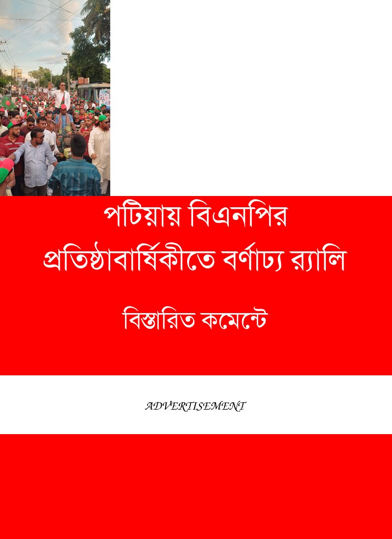 পটিয়া পৌরসভা বিএনপির সাবেক আহ্বায়ক হাজ্বী নুরুল ইসলাম সওদাগরের সভাপতিত্বে বর্ণাঢ্য র্যালি তে প্রধান অতিথি হিসেবে উপস্থিত ছিলেন চট্টগ্রাম দক্ষিণ জেলা বিএনপির সাবেক সিনিয়র যুগ্ম আহবায়ক আলহাজ্ব এনামুল হক এনাম।