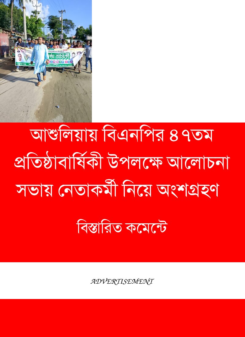 বিএনপির ৪৭তম প্রতিষ্ঠাবার্ষিকী উপলক্ষে আশুলিয়া সরকারি প্রাথমিক বিদ্যালয় মাঠে আশুলিয়া থানা বিএনপির উদ্যোগে আলোচনা সভা অনুষ্ঠিত হয়েছে।আয়োজনে প্রধান অতিথি হিসেবে উপস্থিত ছিলেন ঢাকা ১৯ আসনে সাবেক সাংসদ সদস্য, বিএনপি সহ পরিবার কল্যাণ বিষয়ক সম্পাদক ডা দেওয়ান মোহাম্মদ সালাউদ্দিন বাবু বিশেষ অতিথি হিসেবে বক্তব্য রাখেন সাভারের, জনগণের আস্থাভাজন,সাভার পৌর মেয়র পদপ্রার্থী জনাব মোঃ খোরশেদ আলম ভাই।