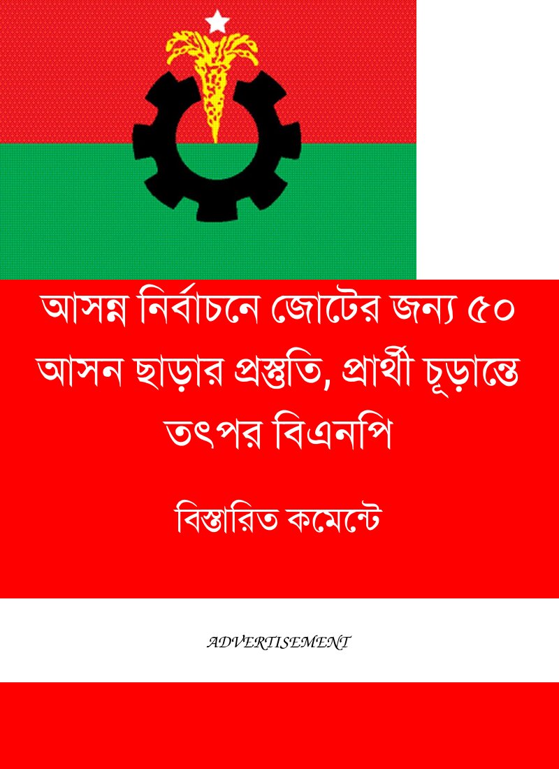 আসন্ন ত্রয়োদশ জাতীয় সংসদ নির্বাচনে ফ্যাসিবাদবিরোধী যুগপৎ আন্দোলনে শরিক সমমনাদের জন্য ৫০টি আসন ছাড়ার প্রাথমিক সিদ্ধান্ত নিয়েছে বিএনপি। পাশাপাশি সারা দেশের যোগ্য ও পরিচ্ছন্ন প্রার্থী চূড়ান্ত করার কাজও দ্রুতগতিতে এগিয়ে চলছে। আগামী মাসের মধ্যে দল ও জোটের প্রার্থী তালিকা চূড়ান্ত করার লক্ষ্য নিয়েছে দলটি।