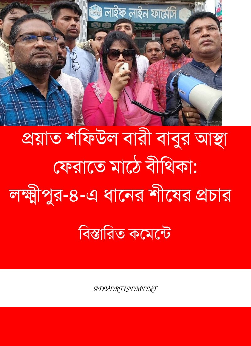 এয়োদশ জাতীয় সংসদ নির্বাচনকে সামনে রেখে লক্ষ্মীপুর-৪ (রামগতি-কমলনগর) আসনে আনুষ্ঠানিকভাবে নির্বাচনী প্রচারণায় নেমেছেন বিএনপি মনোনীত সংসদ সদস্য পদপ্রার্থী বীথিকা বিনতে হোসাইন। প্রয়াত নেতা শফিউল বারী বাবুর স্ত্রী বীথিকা বুধবার (১ অক্টোবর) বিকেলে তাঁর নির্বাচনী এলাকার ৩টি গুরুত্বপূর্ণ পয়েন্টে দলীয় নেতাকর্মীদের সাথে নিয়ে পথসভা করেন এবং জনগণের কাছে ধানের শীষ প্রতীকে ভোট চান।