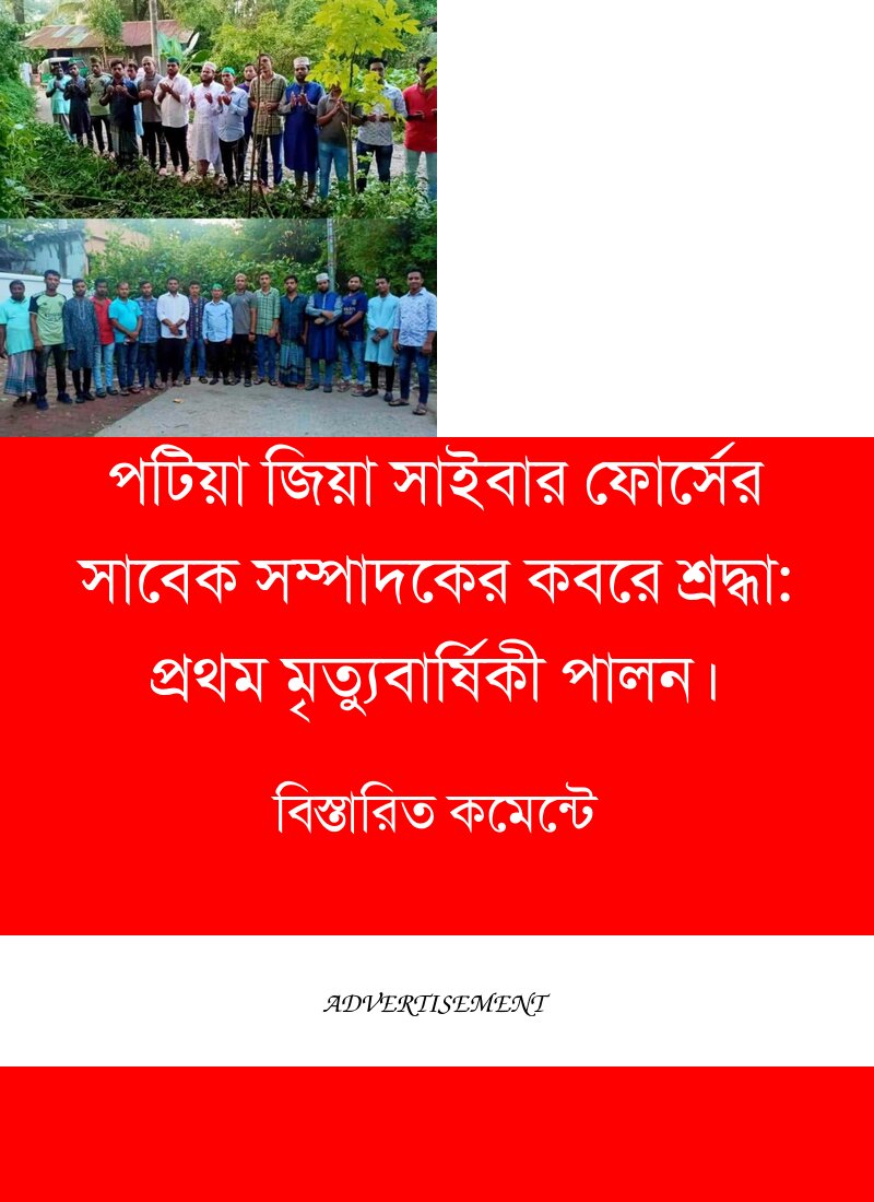 চট্টগ্রাম দক্ষিণ জেলার আওতাধীন পটিয়া উপজেলা জিয়া সাইবার ফোর্সের সাবেক সাংস্কৃতিক সম্পাদক মরহুম রবিউল হোসেন আদর-এর প্রথম মৃত্যুবার্ষিকী উপলক্ষে তাঁর কবরে গভীর শ্রদ্ধা নিবেদন ও কবর জিয়ারত করেছেন সংগঠনের নেতৃবৃন্দ।