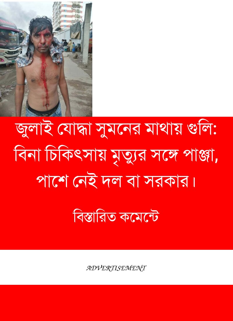 জুলাই (২০২৪) গণ-অভ্যুত্থানের অন্যতম যোদ্ধা এবং লক্ষ্মীপুর জেলার কমলনগর উপজেলা স্বেচ্ছাসেবক দলের যুগ্ম-আহ্বায়ক ও জেলা স্বেচ্ছাসেবক দলের সহ-সাধারণ সম্পাদক মো. সুমন হোসেন বর্তমানে জীবন-মৃত্যুর সন্ধিক্ষণে। গত ৫ই আগস্ট সৈরাচারী ফ্যাসিবাদী আওয়ামী লীগ ও সাবেক সরকারের পেটোয়া বাহিনী-প্রশাসনের গুলিতে গুরুতর আহত হন তিনি। ঢাকার যাত্রাবাড়ী মোড়ে আন্দোলন চলাকালীন তাঁর মাথায় গুলি লাগে। কোনোমতে প্রাণে বেঁচে গেলেও বর্তমানে তিনি নিয়মিত চিকিৎসাধীন অবস্থায় মৃত্যুর সঙ্গে কঠিন পাঞ্জা লড়ছেন।জানা যায়, মো. সুমন হোসেন দীর্ঘ ১৭ বছর ধরে বাংলাদেশ জাতীয়তাবাদী দল (বিএনপি) ও এর অঙ্গসংগঠনের একজন নিবেদিতপ্রাণ সৈনিক। এর আগেও গত ২৮শে অক্টোবর ২০২৩ তারিখে ঢাকা মহাসমাবেশ থেকে তিনি গ্রেপ্তার হন এবং প্রায় দেড় মাস জেল খেটে মুক্তি পান।